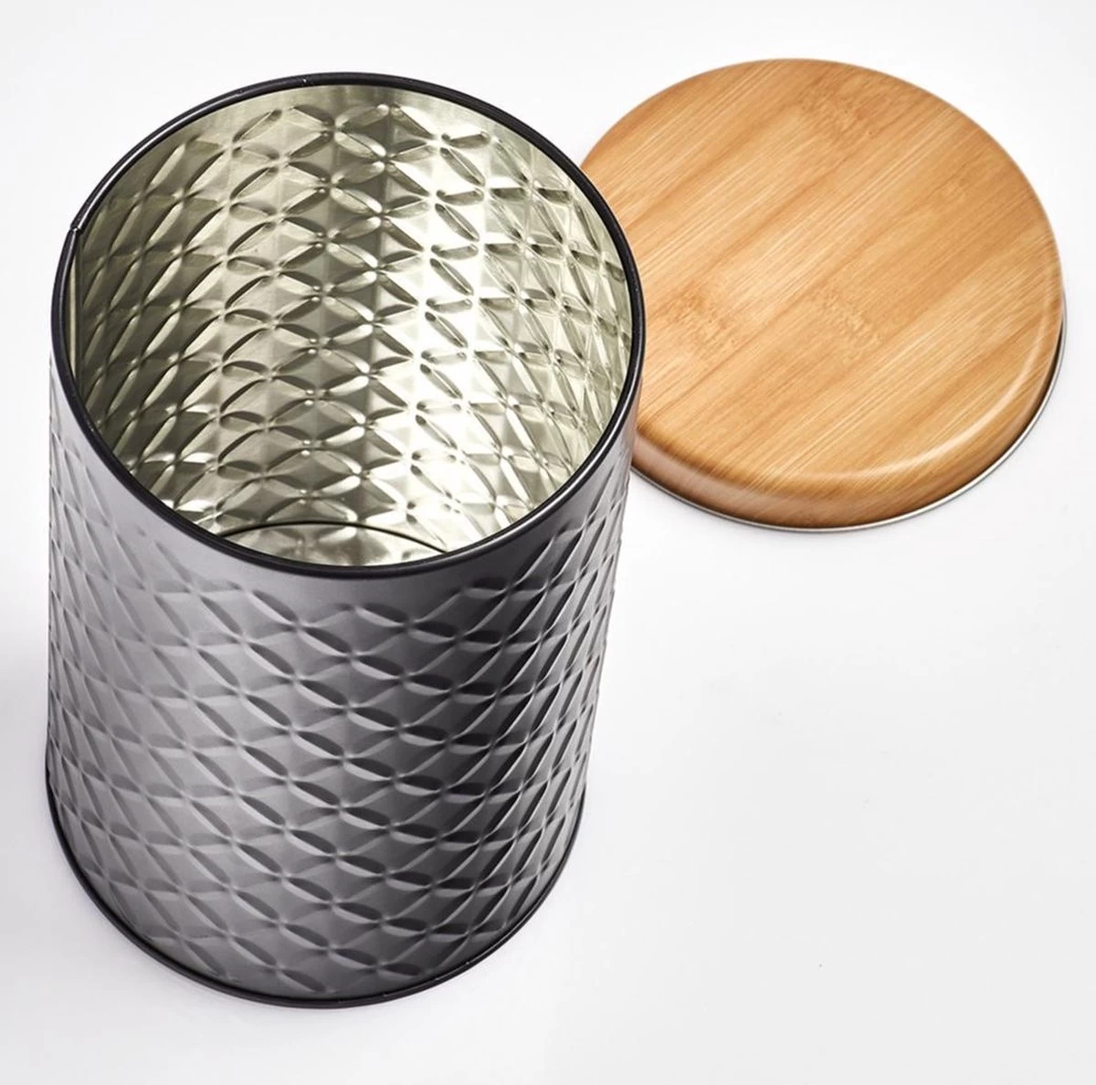 2x Zwarte bewaar/voorraad blikken voor bijvoorbeeld snoep, koek en suiker. De deksel is lucht/geurdicht, waardoor de inhoud vers en vochtvrij blijft. De trommel heeft een houtlook deksel.