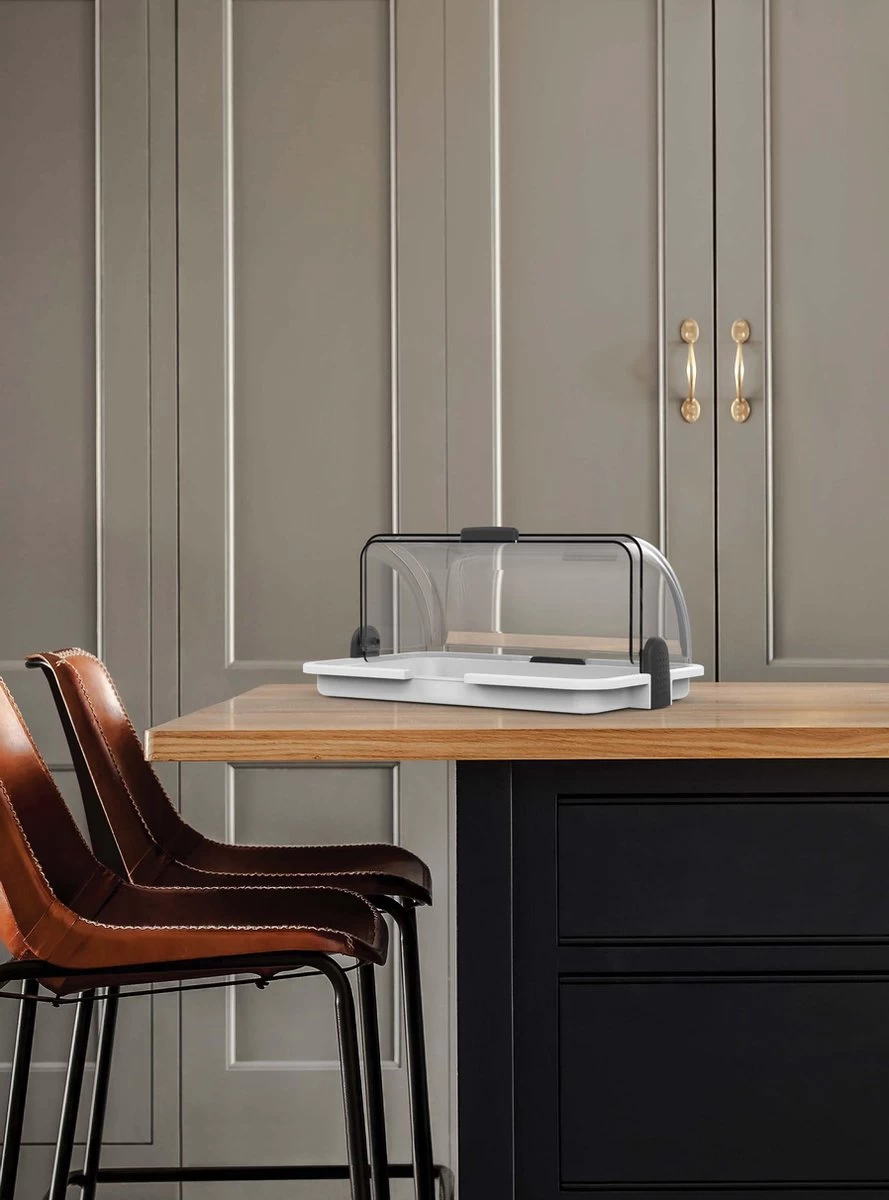 Deze kunststof broodtrommel (afmeting: 38*26*17cm) heeft een transparante deksel met een witte bodem en zwarte accenten. Deze trommel is naast het bewaren van brood, koek en taart ook prima geschikt voor het presenteren van hapjes zodat deze niet te snel “oud” worden. Het merk Biesse is een Italiaans product dat bekend staat om zijn vooruitstrevend design en onderscheid zich door uitstekende kwaliteit. Productie is geheel in Italië
