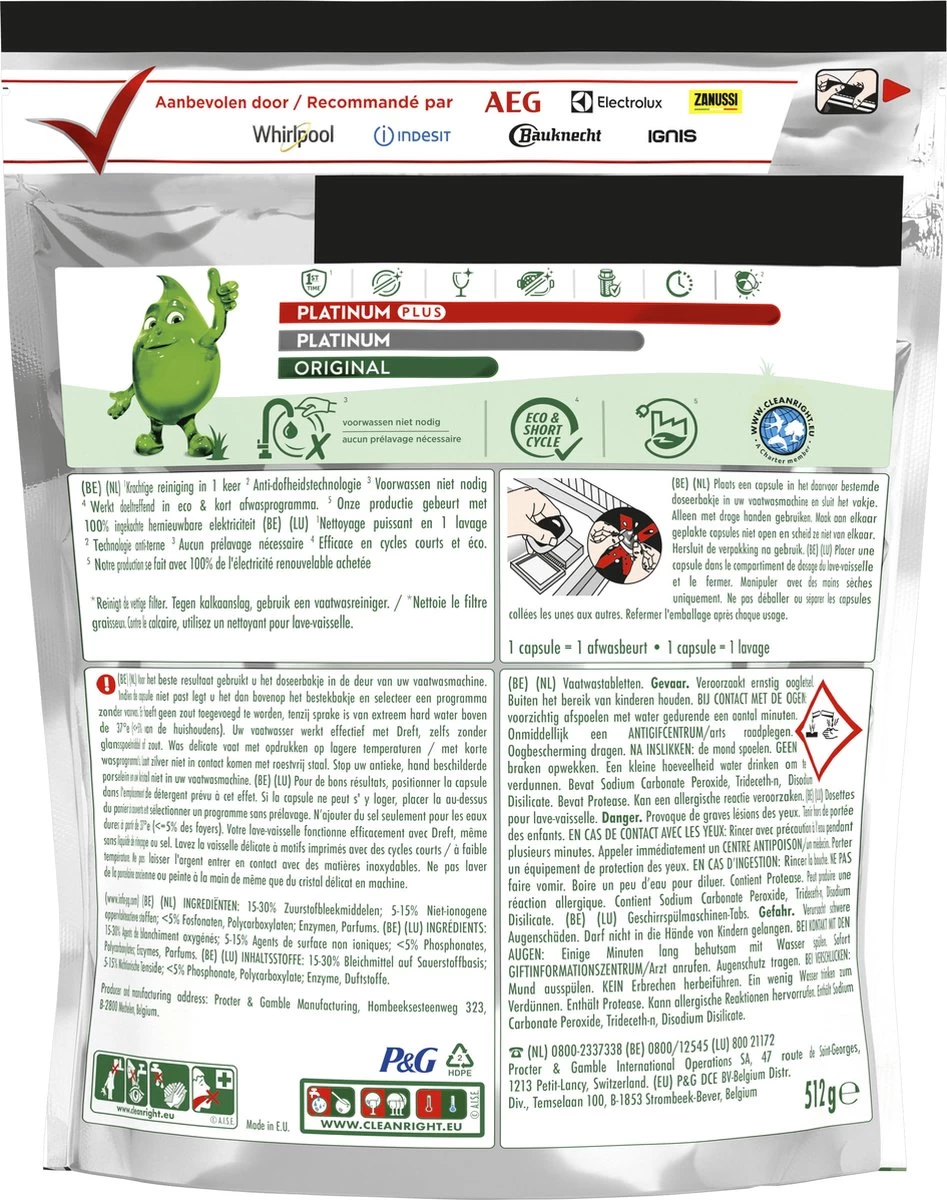 Dreft Platinum Plus All In One Vaatwastabletten bieden je een uitzonderlijk schone vaat in slechts korte tijd. Dreft Platinum Plus geeft je een uitmuntende reiniging en verwijdert hardnekkige voedselvlekken, zelfs in de testconditie van een korte cyclus. Dus als je weinig tijd hebt, dan is dat geen enkel probleem. Stap over op kort. Dreft combineert vloeistof en poeder in één krachtige tablet. Het ultra-oplosbare zakje lost snel op en werkt goed in korte cycli omdat het snel begint te reinigen om de klus klaar te krijgen. En ze zijn gemakkelijk te gebruiken. Plaats ze gewoon in het doseerbakje van je vaatwasser, met verpakking. Schakel over op de korte cyclus en bespaar tijd, energie en water in vergelijking met een gewone, standaard cyclus.