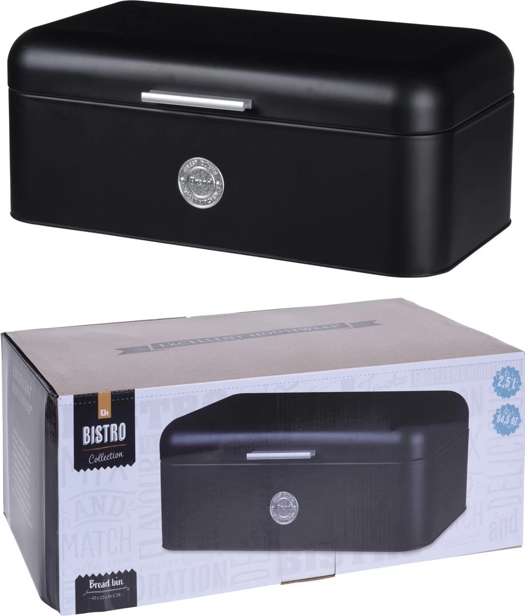 Meestal eet je niet in één dag een heel brood op. Dan wil je dat deze de volgende dag ook nog lekker vers is. Deze zwarte metalen broodtrommel met klepdeksel van Excellent Houseware is ideaal voor het bewaren en vers houden van je brood. De broodtrommel sluit goed af waardoor het brood langer vers blijft. Daarbij wordt het brood beschermt tegen licht en vocht zodat er geen schimmel ontstaat. De broodtrommel is gemaakt van hoogwaardig metaal en ook geeft de mat zwarte kleur het product een chique uitstraling.