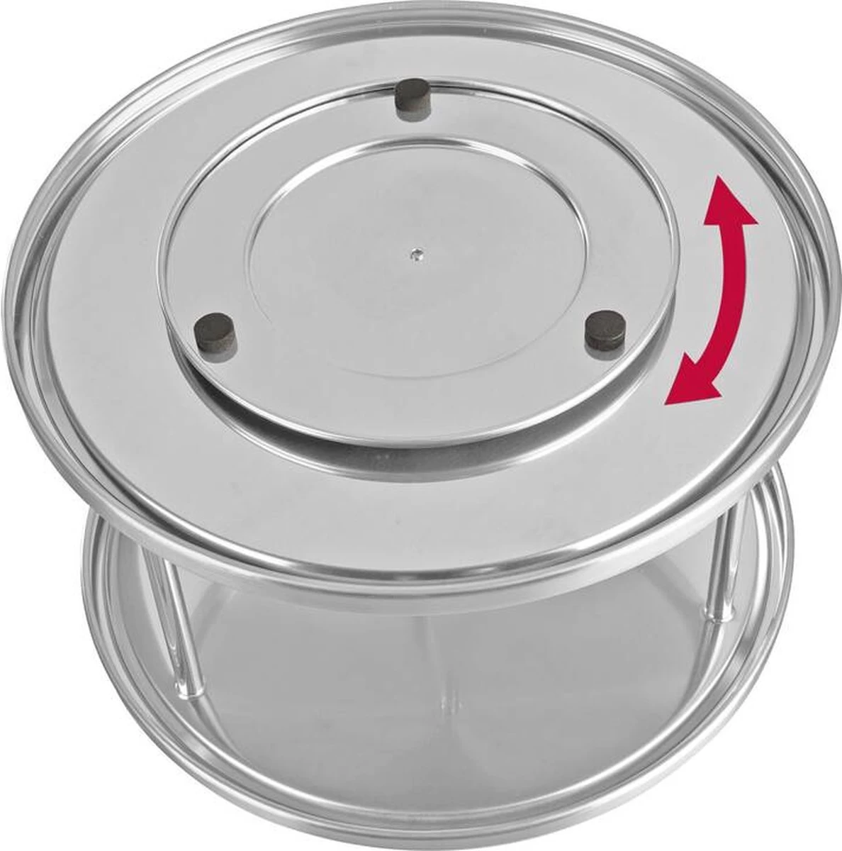 Met zijn elegante uiterlijk slaat de kastrondel niet alleen een goed figuur in de kast maar biedt hij zich ook aan als decoratieve organisatieoplossing voor het werkblad. Vooral hobbykoks zijn dol op de dubbeldekker omdat op de twee schappen veelgebruikte specerijen kruiden oliën en azijnen kunnen worden opgeborgen. Lang rommelen in het kruidenrek behoort tot het verleden want zout saffraan of de goede walnootolie zijn altijd binnen handbereik.