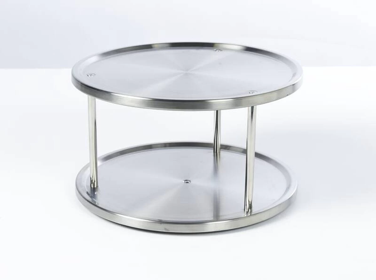 De kastrondel dubbele dekker is een echt opruimingswonder. Met zijn twee legplanken die 360 graden kunnen worden gedraaid biedt het slimme ruimtebesparende rek in een handomdraai flexibele opbergruimte die op verschillende manieren kan worden gebruikt. En het kan gebruikt worden waar je het nodig hebt. De draaimolen demonstreert zijn opruimtalent onder andere in het keukenkastje. Hier kan het roestvrijstalen draaiplateau worden gebruikt om bakingrediënten specerijen glazen en ander keukengerei te organiseren. Dankzij het dubbeldeks rek is het niet langer nodig de ladder op te klimmen om het meel helemaal achteraan in de kast te bereiken. In plaats daarvan volstaat een snelle draai aan het desbetreffende rek en het gewenste ingrediënt is binnen handbereik – zonder klimmen of rekken.