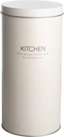 Het opbergblik is gemaakt van metaal en heeft een afmeting van ø 11 x 22 cm. Op de voorkant staat de tekst Kitchen. Let op, mag niet in de vaatwasser.