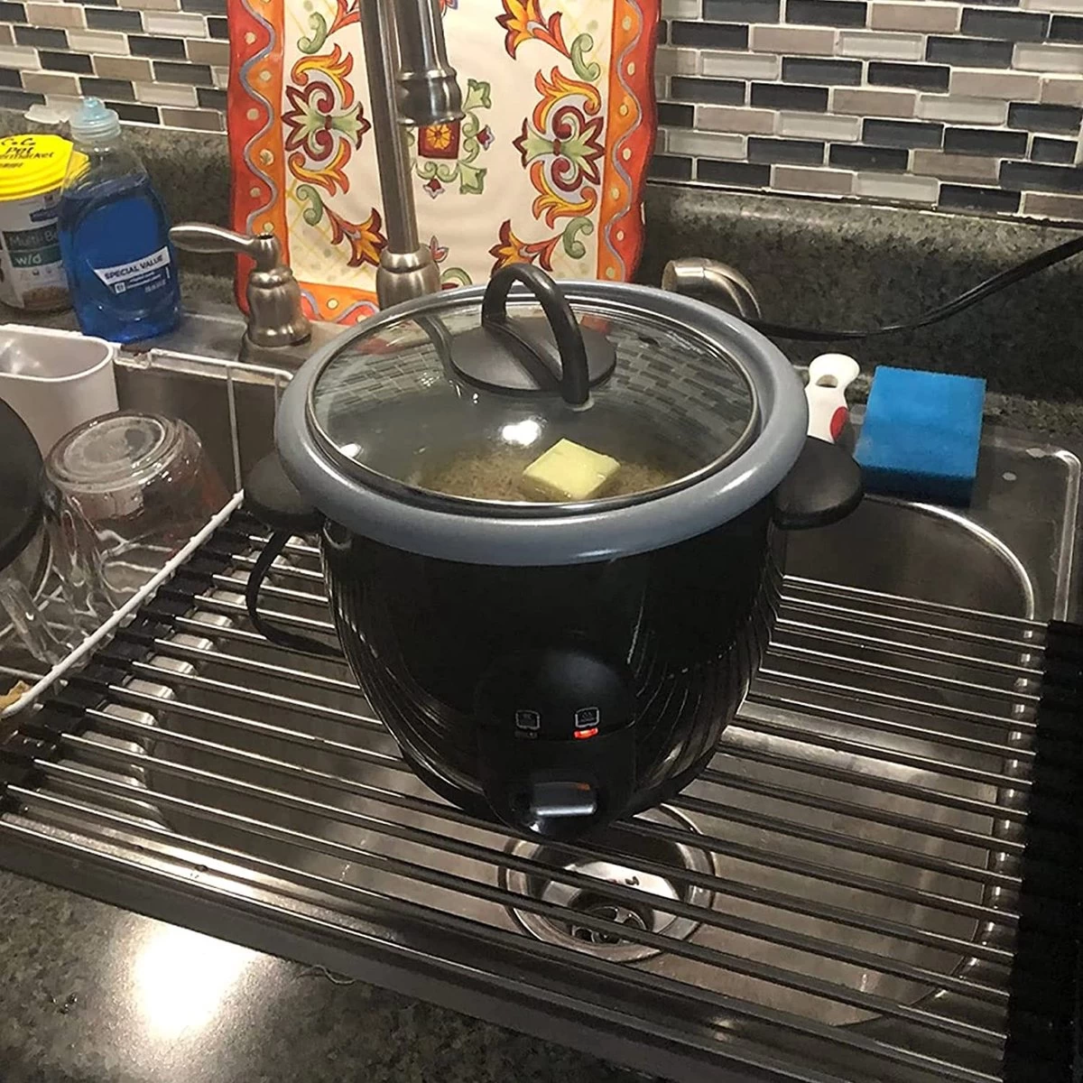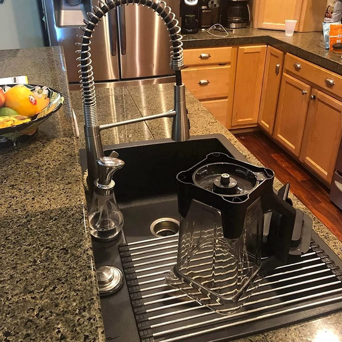 Het probleem met de meeste bordenrekken is dat ze ruimte in beslag nemen. Ons oprolbare afdruiprek heeft een flexibel ontwerp, het rolt op als een gootsteenmat en neemt minimale ruimte in beslag. Dit maakt hem ideaal voor elke keuken. Gemaakt van roestvrij staal en volledig bedekt met siliconen van voedingskwaliteit, waardoor het rek volledig slipvrij blijft. Het is hittebestendig tot 205 graden.