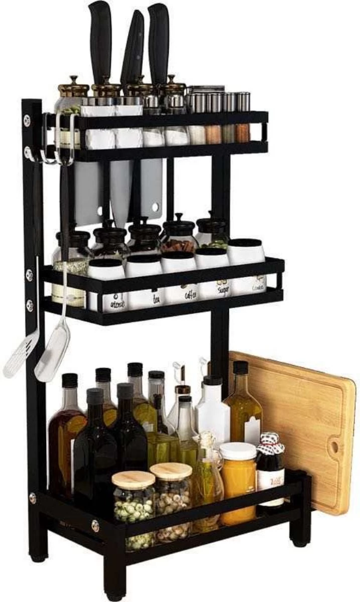 Ook altijd zijn rommeltje in de keuken? Dit kruidenrek is precies wat je nodig hebt in de keuken. Bespaar geld en ruimte met ons staand kruidenrek. 3-laags kruiden heeft bredere ruimte om genoeg accessoires te dragen. Dit unieke Kruidenrek komt met grote messenhouder, bestekhouder en ophang haakjes voor je keukengerei.