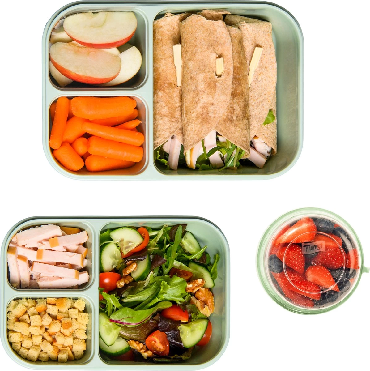Dankzij de bakjes in de lunchboxen is het mogelijk om verschillende producten gescheiden van elkaar mee te nemen en te bewaren.