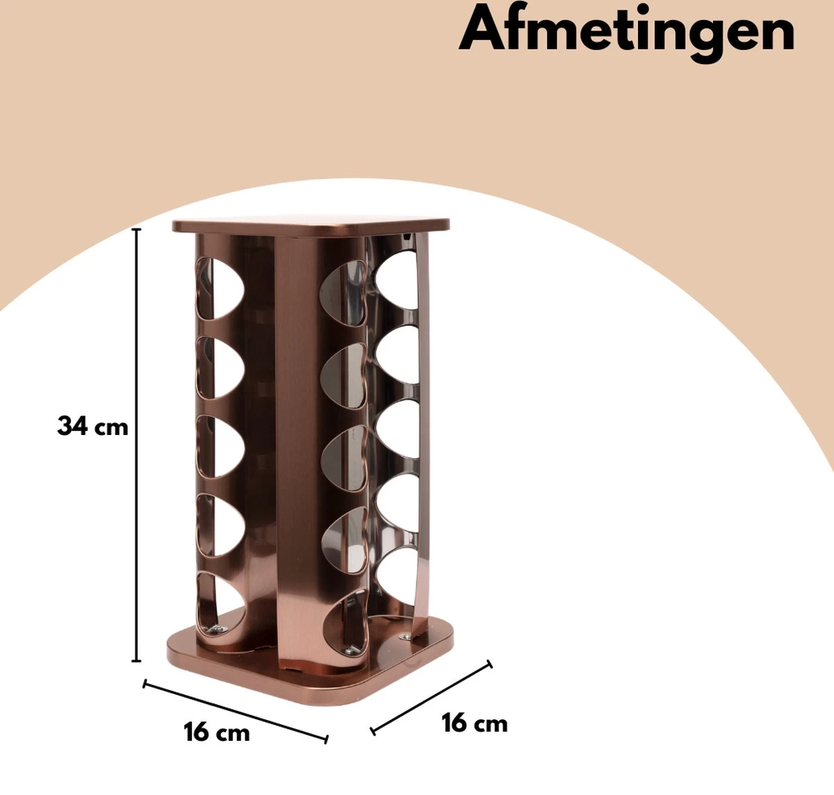 Geen overvolle lades of kasten meer door dat overal kruiden en specerijen staan maar een overzichtelijk en opgeruimde keuken door het gebruik maken van onze kruidencarrousel. Door de 20 bijgeleverde glazen potjes kun jij jouw favoriete kruiden en specerijen kwijt in het kruidenrek en ruimte besparen in de keuken. Een stijlvolle en moderne uitstraling waarbij het de carrousel uitstekend past in elke keuken.