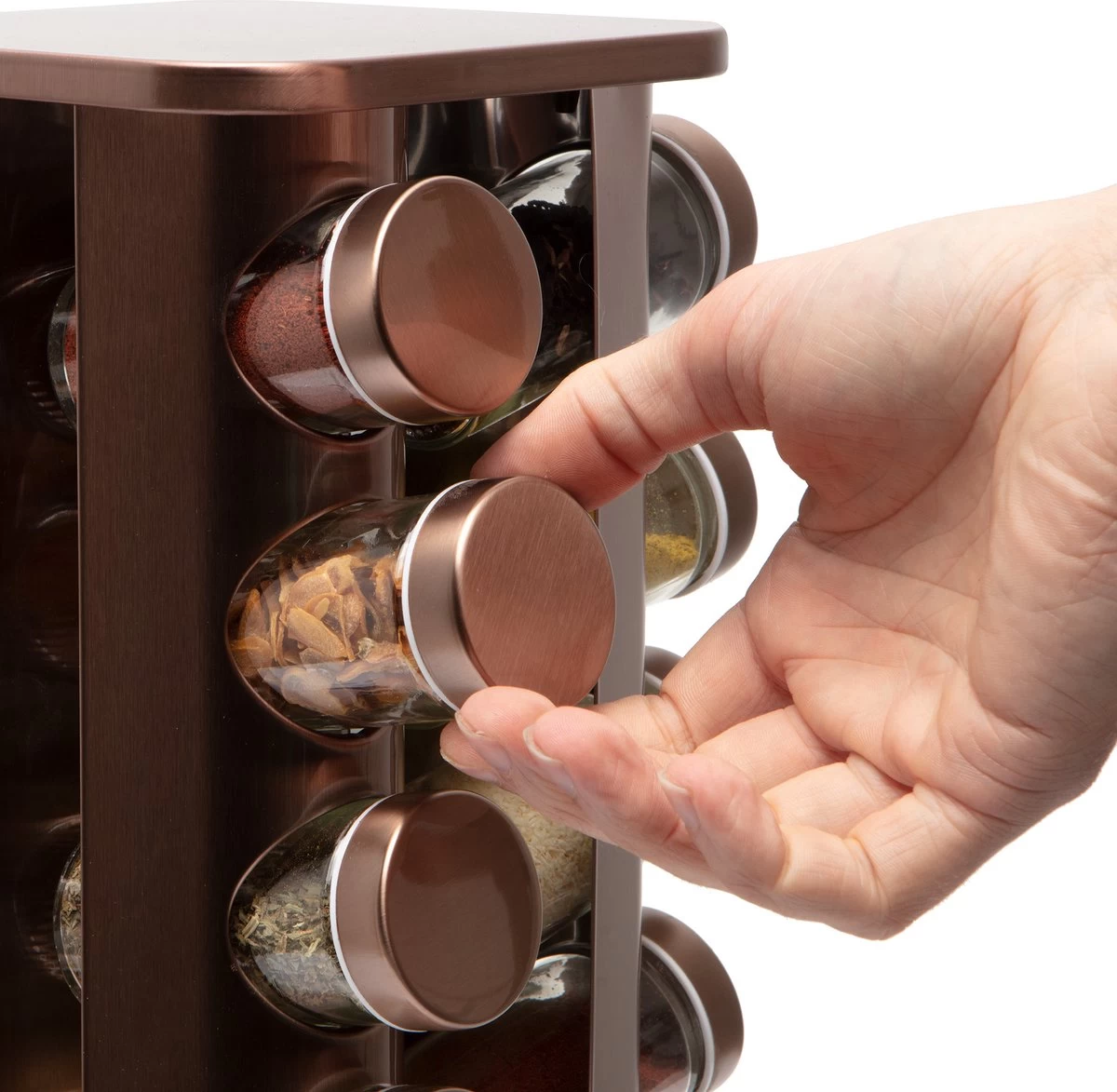 De carrousel draait soepel waarbij de potjes goed blijven zitten in de houder. Je kunt eenvoudig de kruidenpotjes vullen en kiezen tussen een fijne of grove dosering. De dekseltjes van de glazen potjes zijn gemakkelijk te openen en zijn zeer stevig, zo kun jij genieten van veel gemak tijdens het koken van het eten.